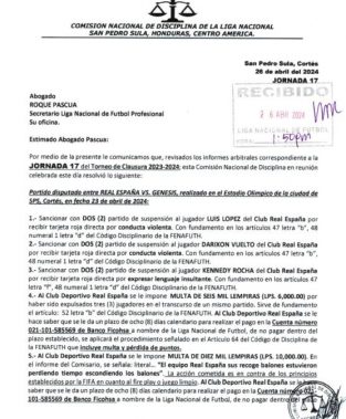 La Comisión de Disciplina de la Liga Nacional no perdonó a los protagonistas del zafarrancho protagonizado en el partido entre Real España y Génesis por la jornada 17 del torneo Clausura 2024 disputado el pasado martes en el Estadio Olímpico de San Pedro Sula.