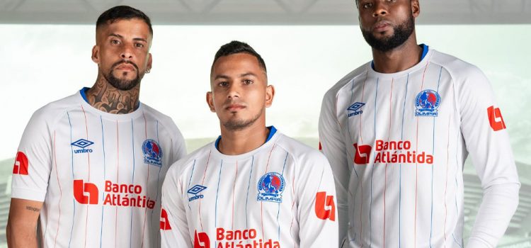 La camisa de local no pierde su identidad donde el blanco es el predominante, lo destacable son unas pequeñas líneas verticales de color azul y rojo que dan un toque atractivo, además se mantiene el escudo y en letras grade el nombre de Banco Atlántida principal patrocinador de Olimpia.