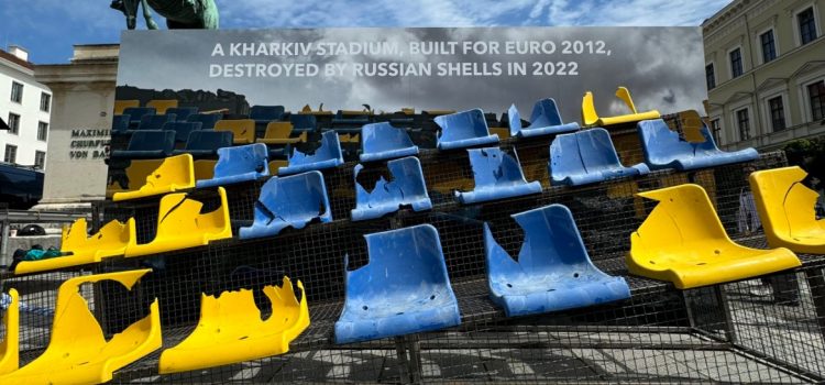 Asientos amarillos y azules, los colores de la bandera ucraniana, destrozados y unidos por un trozo de la valla de seguridad del estadio Sonyachny de Kharkiv, en el nordeste del país, fueron expuestos al pie de la estatua de Maximiliano I, duque de Baviera.