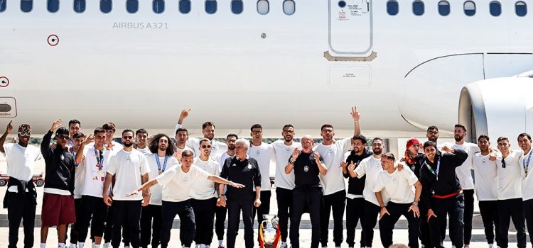 Después ellos fueron apareciendo el resto; Pedri con una bandera de Canarias, Fermín con otra mitad andaluza y mitad española, Rodri Hernández con el trofeo de mejor jugador del torneo… hasta ubicarse en grupo frente al avión para una foto de familia.