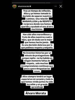 A pesar de que Alice ha intentado calmar las aguas, las dudas no hicieron más que crecer. Este lunes, Álvaro Morata ha roto el silencio con una declaración en su cuenta de Instagram, confirmando la separación. “Tras un tiempo de reflexión, Alice y yo hemos decidido separar nuestros caminos. Una relación maravillosa y de respeto recíproco donde nos hemos querido y ayudado el uno al otro muchísimo”.