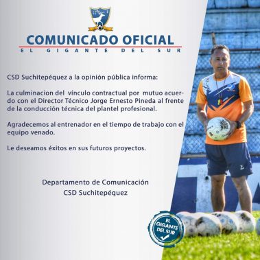 Los directivos de los Venados informaron que no seguirán contando con los servicios del entrenador hondureño. «Suchitepéquez informa la culminación del vínculo contractual por mutuo acuerdo con el Director Técnico Jorge Ernesto Pineda al frente de la conducción técnica del plantel profesional», dice el comunicado sin explicar la razón de su salida.