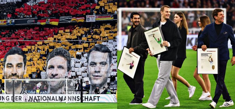 Los futbolistas alemanes Thomas Müller, Manuel Neuer e Ilkay Gündogan recibieron este lunes un homenaje por parte de la Federación Alemana de Fútbol (DFB) previo al partido de la Liga de Naciones que enfrentó a su selección contra Países Bajos, en un acto al que no acudió Toni Kroos, también anunciado, pero que alegó problemas de agenda.