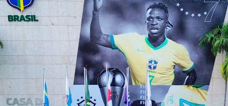 La Confederación Brasileña de Fútbol (CBF) presentó este domingo una nueva imagen de la fachada de su sede, en Río de Janeiro, que ahora exhibe una gran fotografía de Vinicius Jr con la camiseta de la selección y la leyenda: «El mejor del mundo es nuestro».